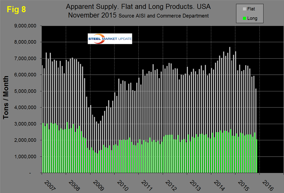 SMU Comment: Figures 2, 4, 5 and 7 show that there has been a distinct decline in shipments for all products since the middle of last year. This MSCI data is now looking more like our report of total supply to the market which is based on AISI shipment and import data. Total supply of flat rolled products peaked in December last year, dropped sharply in February then through August didn’t change much. However in November supply was the lowest since March 2010 as shown in Figure 8. Note that this supply data is one month behind the MSCI information.