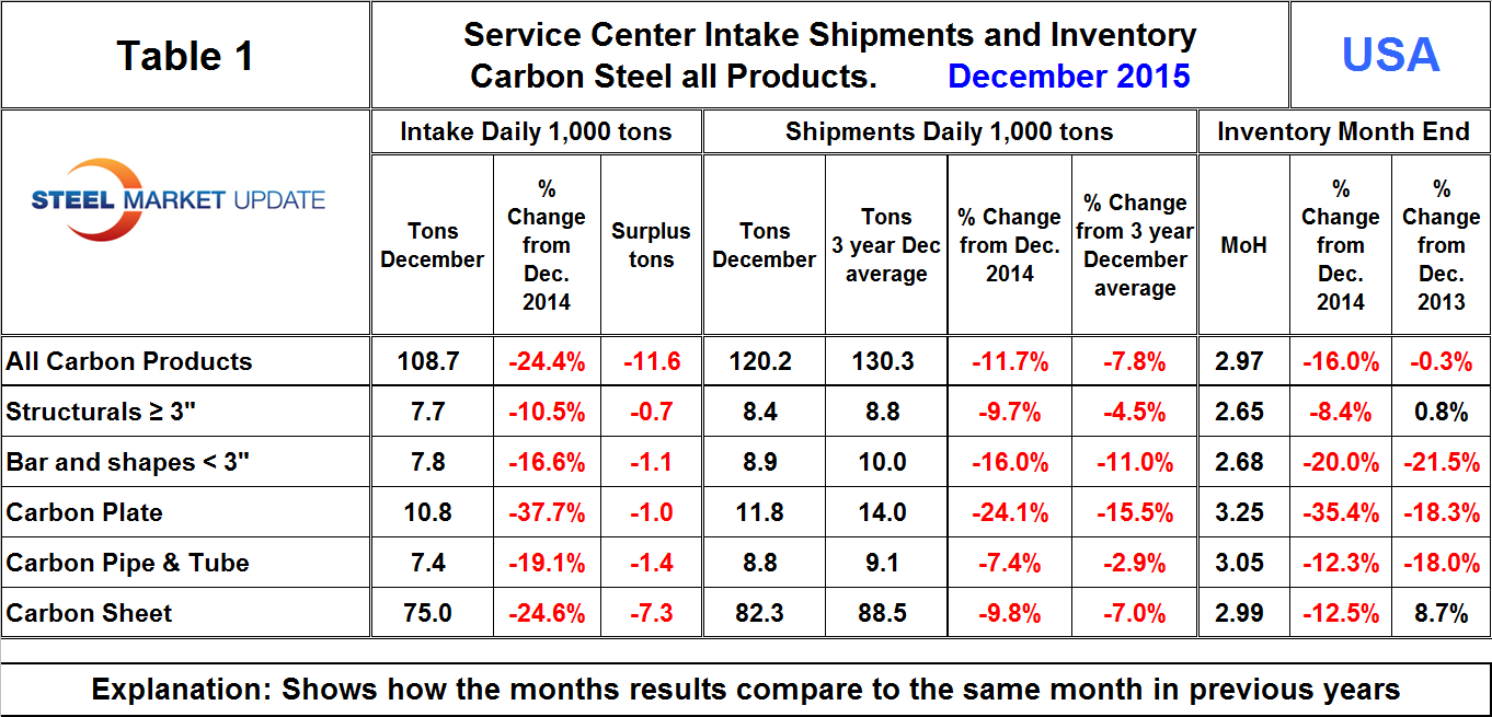 Table 1 shows the performance by product in December compared to the same month last year and also with the average t/d shipments for December in the last three years. We then calculate the percent change between December 2015 and December 2014 and with the 3 year December average. Our intention is to provide an undistorted view of market direction.