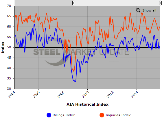 Below is a graph showing the history of American Institute of Architects ABI Index and Project Inquiries Index. You will need to view the graph on our website to use it’s interactive features, you can do so by clicking here. If you need assistance with either logging in or navigating the website, please contact our office at 800-432-3475 or info@SteelMarketUpdate.com.