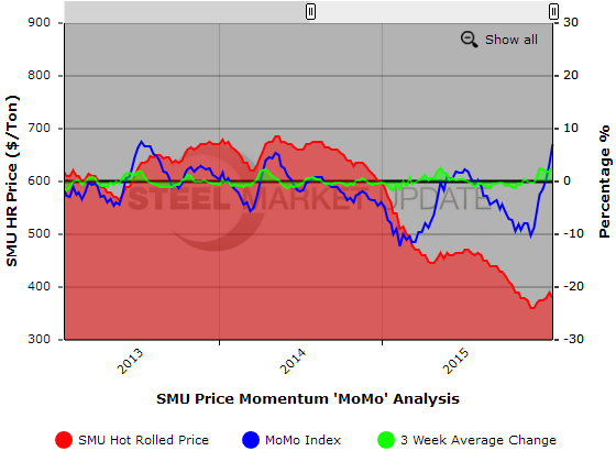 MoMo was measured at 7.05 percent this week, meaning that the current HRC price is higher than the average price over the last 12 weeks.