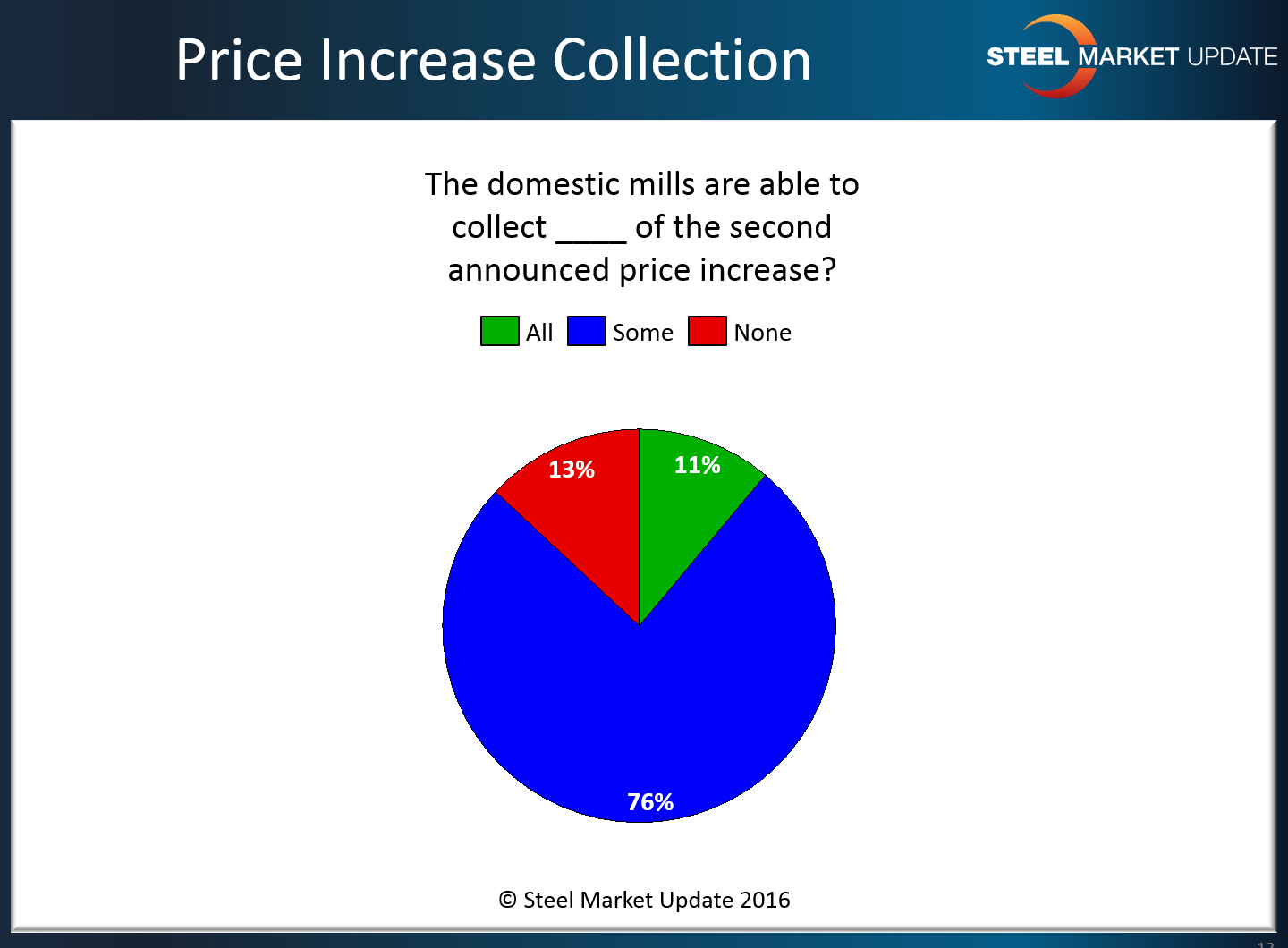 In our latest assessment of the flat rolled market, we asked whether the domestic mills will be able to collect all, some or none of the January price increase. Seventy-six percent of respondents said that the mills would be able to collect some of the increase, 11 percent thought all of the increase would be collected, and 13 percent thought none of it would be collected.