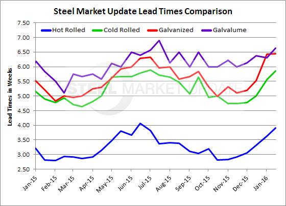 Galvalume lead times, which had been relatively stable in recent weeks at about 6.3 weeks, moved out slightly to 6.63 weeks. Lead times now are about a half a week longer than what we saw in November and almost a week longer than what we reported in mid-January 2015.
