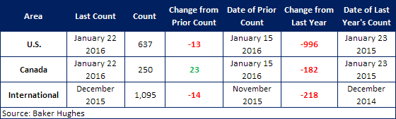 According to Baker Hughes data from January 22, 2016, the U.S rig count for the week was 637 rigs exploring for or developing oil or natural gas. This is a decrease of 13 rigs when compared to last week, with oil rigs down 5 to 510 rigs, gas rigs down 8 to 127 rigs, and miscellaneous rigs unchanged at 0 rigs. Compared to this time last year, the 637 count is down 996 rigs, with oil rigs down 807, gas rigs down 189, and miscellaneous rigs unchanged.