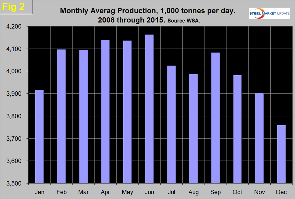 In 2015 the uptick was delayed until April and clearly the high point of 2014 has not been reached this year. Figure 2 shows the average monthly production by month in the 8 years since 2008.
