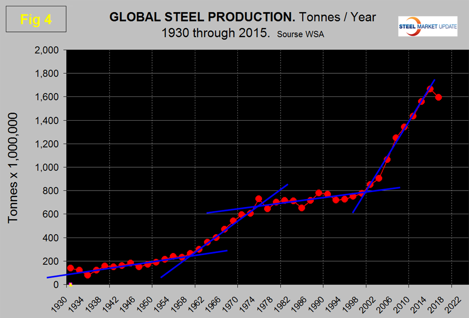 Figure 4 shows global annual production since 1930 and the four distinct growth phases.