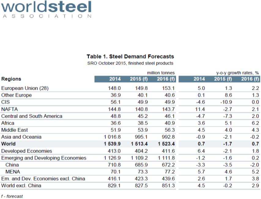 In October the World Steel Association publishing their latest Short Range Outlook (SRO) for apparent steel consumption in 2015 and 2016. We will leave these in our monthly updates until the April 2016 revision is released. (Note this forecast is steel consumption, not crude steel production which is the main thrust of what you are reading now.) The first table of the SRO is by region and the second for the top 10 consuming nations.