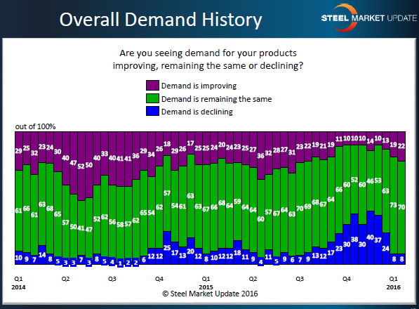 The graphic below depicts the results from all of the respondents participating in our market analysis this past week. Our Premium level members will have a more detailed look at the results as we have demand questions for our manufacturing and service center respondents separate from what we are showing below. Our Premium customers can view our Power Point presentation with those responses and much more online.