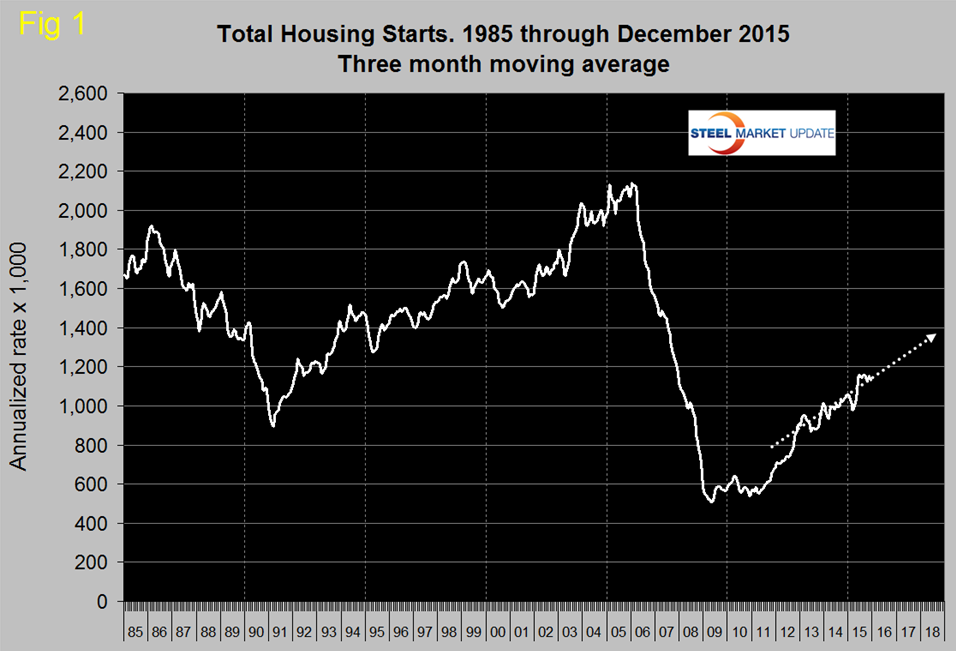 Total housing starts in December were at an annual rate of 1,149,000 which was down from 1,179,000 in November. Since April total monthly starts annualized have ranged from 1,062,000 to 1,211,000 with the high month being June.