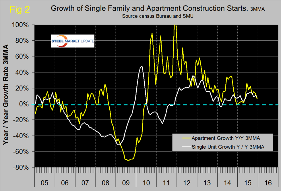 In the first half of 2015 the North East had the highest growth rate driven as mentioned above by apartment construction in New York state but now that has cooled. The South had the most consistent growth in 2015.