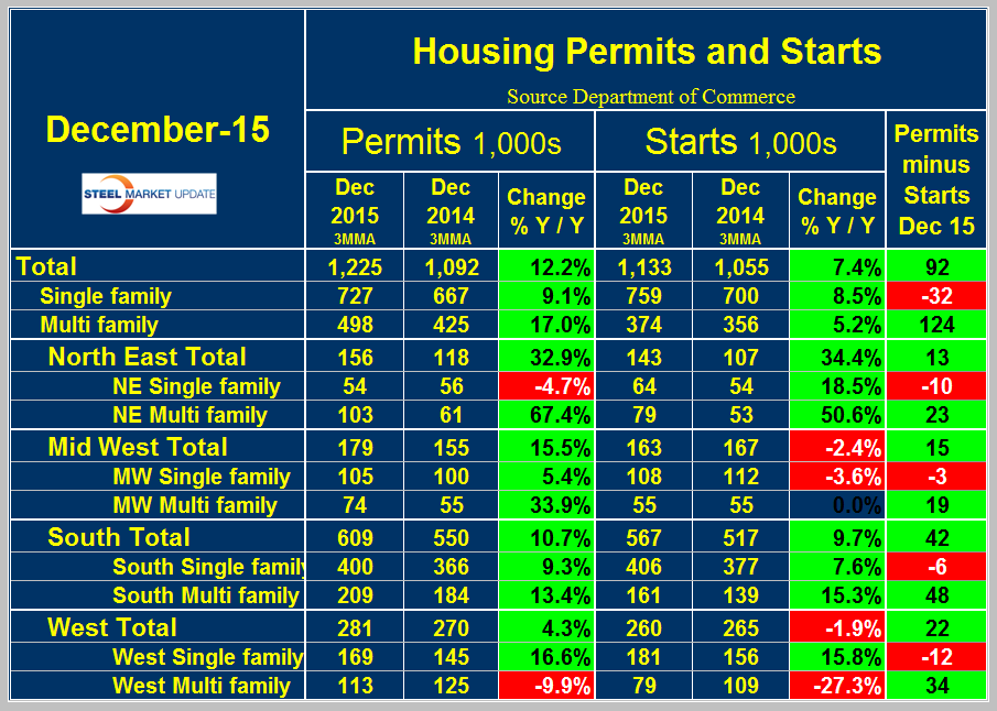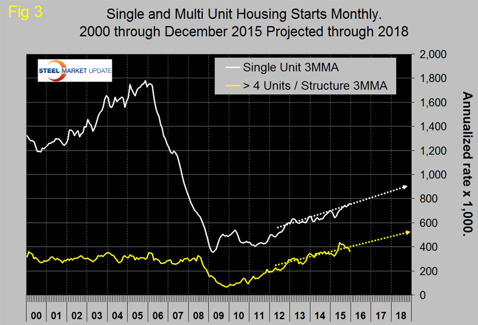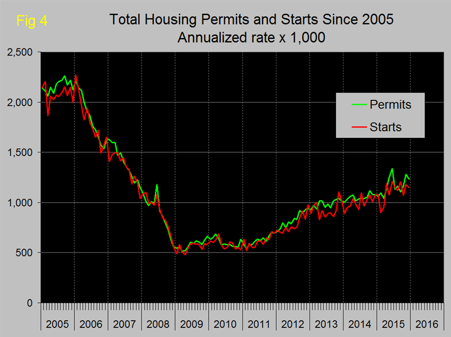 Permit data is considered to be a leading indicator for starts. If permits exceed starts then there should be an acceleration in construction and vice versa. Total permits in December were at an annual rate of 1,232,000 with a 3MMA of 1,225,000. For the second time in 2015, permits were well ahead of starts (Figure 4), however it looks as though permits don’t always lead to ground breaking and sometimes, as in 2013 there can be quite a wide divergence.