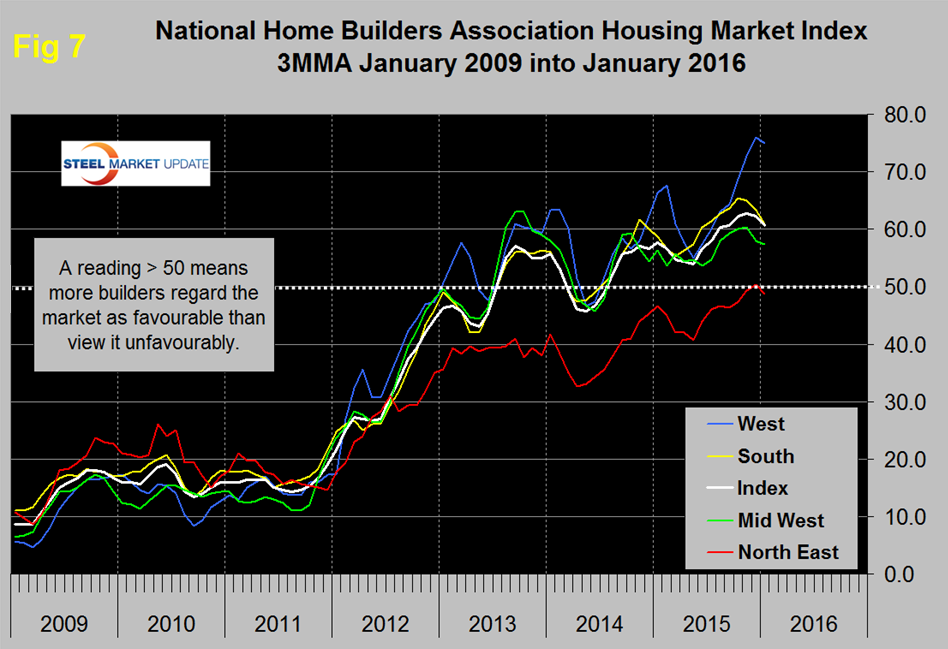 The National Association of Home Builders (NAHB) confidence report was released on Tuesday. Any value above 50 indicates an overall positive business confidence. The national average dropped two points in December then held at 60 in January and is now five points lower than October which had the highest confidence level since our data stream began in January 2009. On a 3MMA basis, the index fell from 62.3 in December to 60.7 in January (Figure 7).