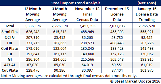 The U.S. Department of Commerce released foreign steel import license data through the 26th of the month late this afternoon. Based on the data to date, January imports are trending toward a 2.5 to 2.7 million net ton level. This would be slightly higher than December’s 2.6 million tons and above November’s 2.4 million tons.