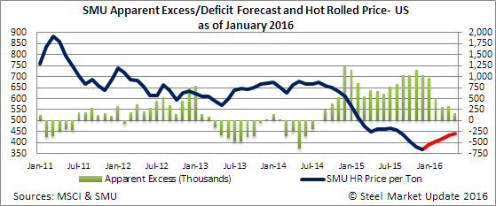 As part of our Premium level service, Steel Market Update (SMU) analyzes the service center shipment and inventory data and provides a short term forecast for carbon flat rolled steel shipments and inventories then we use our proprietary model to determine if distributor inventories are in Apparent Excess or a Deficit situation. Our forecast also includes how we think pricing will move over the next four months. This is done through a proprietary model and the results provided are called the Service Center Apparent Excess/Deficit Forecast.