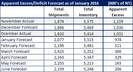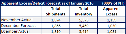 Based on our Apparent Excess/Deficit model we have December as having 1,031,000 tons in excess of what our model considers “balanced” inventories for this time of year and business conditions. Our original forecast was for the excess to be 1,030,000 tons.