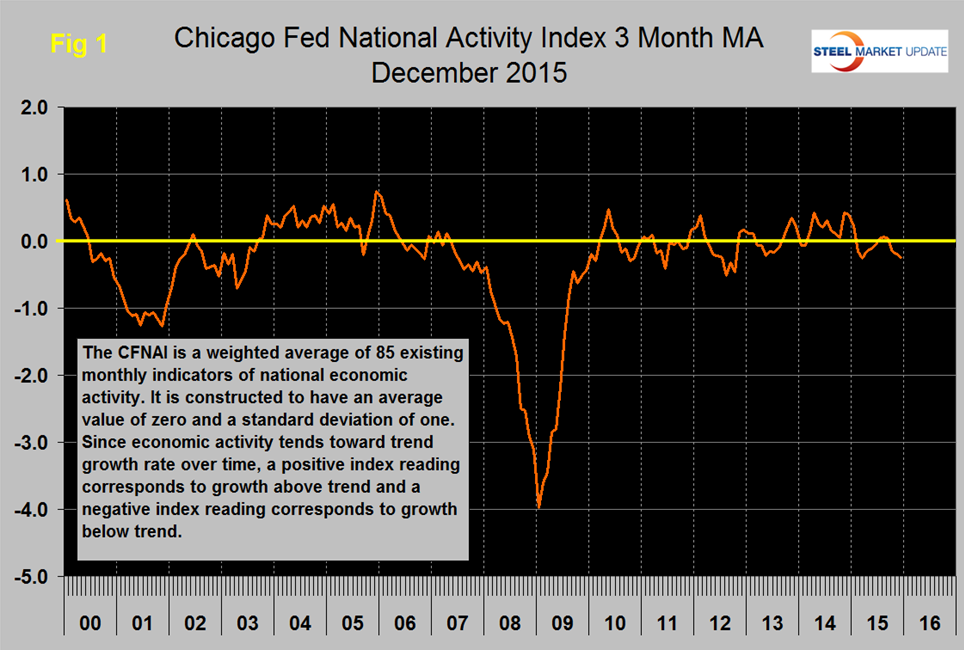 The following is the Chicago Federal Reserve statement followed by our own graphical analysis. The CFNAI is an excellent reality check for much of the economic analysis that we routinely provide in The Steel Market Update and is also a reasonably good predictor of the direction of steel demand with a six to nine month lead. For example by the time the steel market went off the cliff in September 2008, the CFNAI had been signaling an increasingly severe problem for eight months. Then in the first Q of 2009 the CFNAI was recovering as steel supply was still going south. An explanation of the Index is provided at the end of this piece.