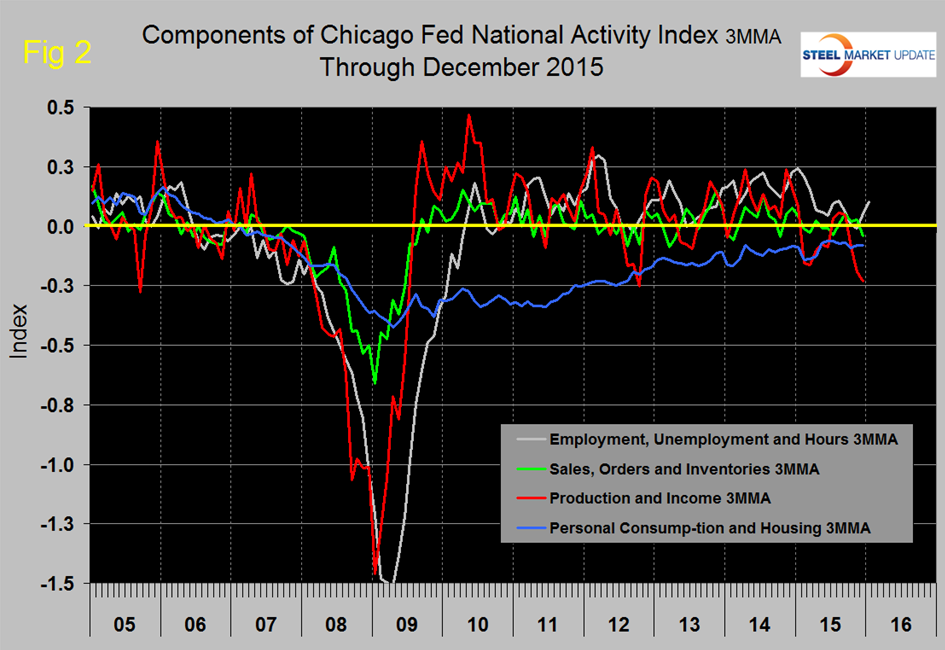 The CFNAI declined for three straight months through November then picked back up in December (see explanation below). Figure 1 shows the SMU analysis of the three month moving average (3MMA) through December and that the index was slightly positive each month July through September, declined to negative 0.16 in October, to negative 0.19 in November and negative 0.24 in December.