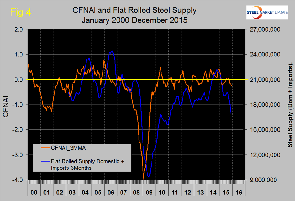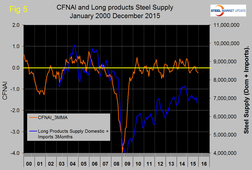 The difference is quite dramatic and qualitatively in agreement with our analysis of steel service center shipments. For long products the supply picture developed from data provided by the Steel Manufacturers Association is very similar. Flat rolled driven mainly by manufacturing came back in line at the end of 2014 but in 2015 fell off dramatically as demand from the energy sector collapsed. Long products driven mainly by construction is still depressed and since the recession has not come anywhere near where this benchmark predicts. Based on the historical lead of the CFNAI it does not look as though total steel demand will pick up through Q1 2016. Note; steel supply shown is only through November as that is the latest data available.