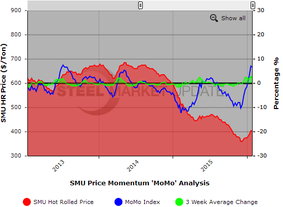 The graph below demonstrates the relationship between the SMU hot rolled coil price, the SMU Price MoMo Index, and the three week moving average change in the MoMo Index. As published in our Tuesday evening issue, the SMU HRC price range for this week is $380-$430 per ton with an average price of $405, unchanged from from last week.