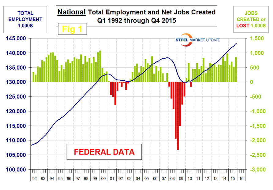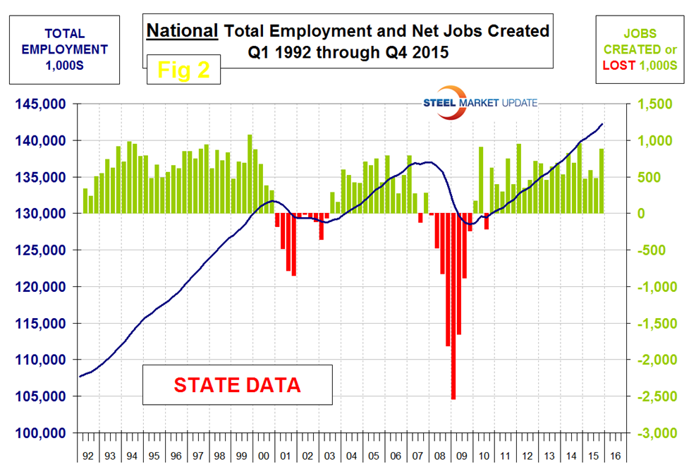 All regions had positive job creation in the 4th quarter. In our last analysis we reported that all regions except the North Central (IA, KS, MN, MO, NE, ND and SD) had positive growth in the 3rd Q. Revisions have resulted in that no longer being the case and all regions had positive growth in each of the last three quarters of 2015. Problems in the oil and gas industries are evident in these regional employment reports. The South Central region (TX, OK, LA and AR) went off a cliff in Q1 2015 after having the highest job creation of any region in the previous quarter. This region rebounded in Q2 through Q4 2015 but is nowhere near where it was before the oil price collapse. In the four quarters since Q4 2014, North Dakota has lost 18,800 jobs, Oklahoma has lost 8,900 jobs but Texas has gained 166,900 jobs. In every quarter of 2015, the Pacific region (CA, OR and WA) has created the most jobs.