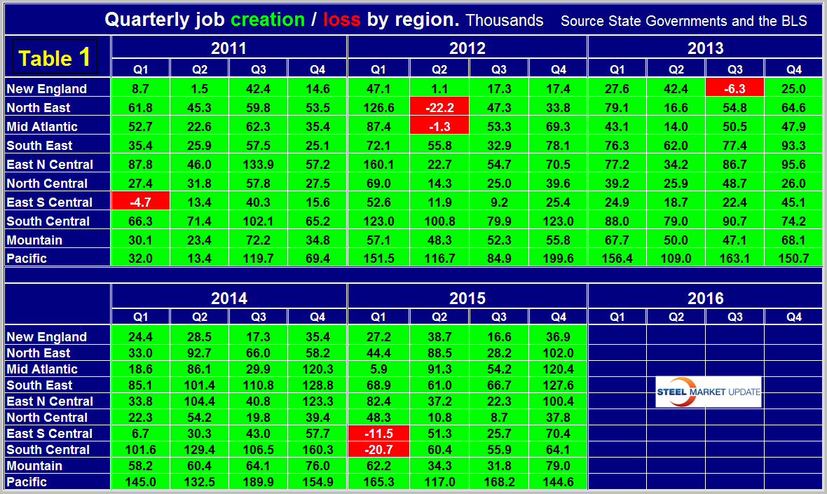 Table 1 shows the history of quarterly job creation by region for the last 5 years.