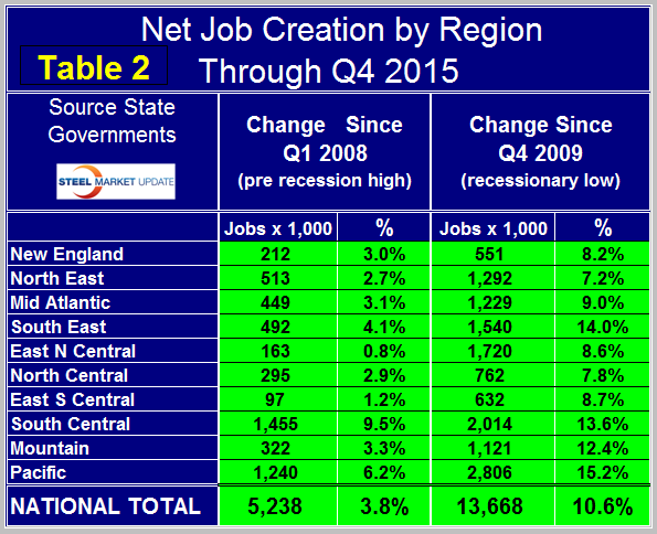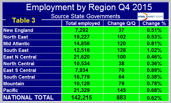 The regions have fared very differently since the pre-recession high of 1st Q 2008 and since the low point of 4th Q 2009. There are now 5,238,000 more people employed than there were immediately before the recession but of that number half occurred in the South Central (TX, LA, AR and OK) and Pacific (CA, OR and WA) regions. The 3rd Q of 2015 was the first time that every region had more people employed than it did at the pre-recession peak. This continued through Q4 (Table 2).