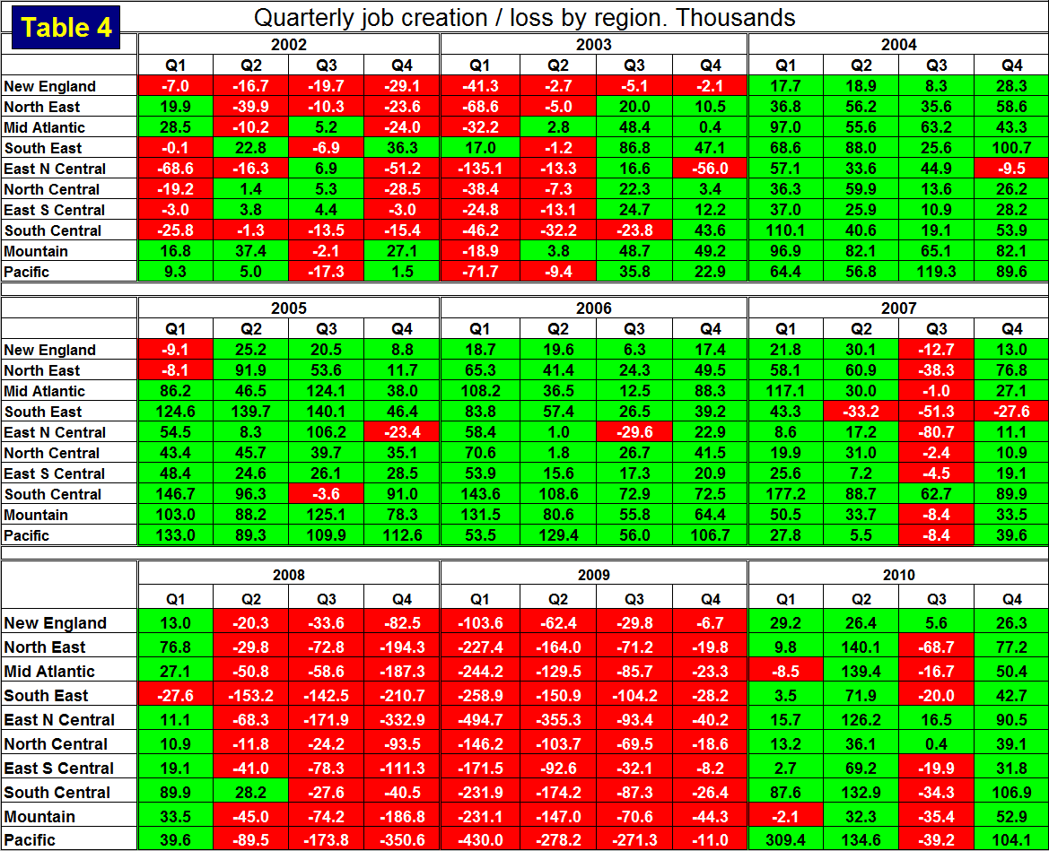 SMU Comment: We thought we would remind readers what recessions look like and have included Table 4 here which is the same as Table 1 but for the years 2002 through 2010. This makes the recent job creation performance look excellent and as we have stated in our housing and auto production reports in the last few days, “we think the reports of an impending recession that are now cropping up in the press are greatly exaggerated.”