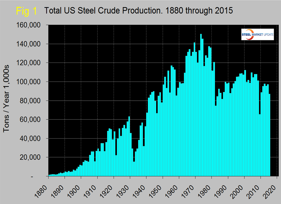 According to the AISI A7 report, total crude steel production in 2015 was 86,912,000 tons, down by 10.6 percent from 2014. Figure 1 puts this into a historical context with 130 years of data.