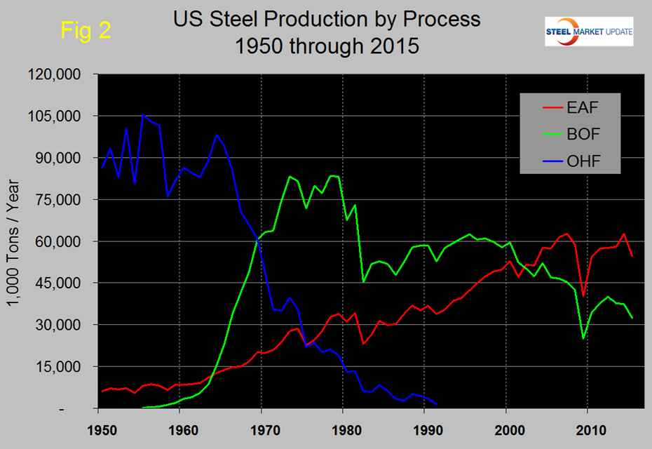 In 2002 the EAF overtook the BOF as the primary production process in the US. In 2015 the mix was 62.7 percent EAF and 37.3 percent BOF.