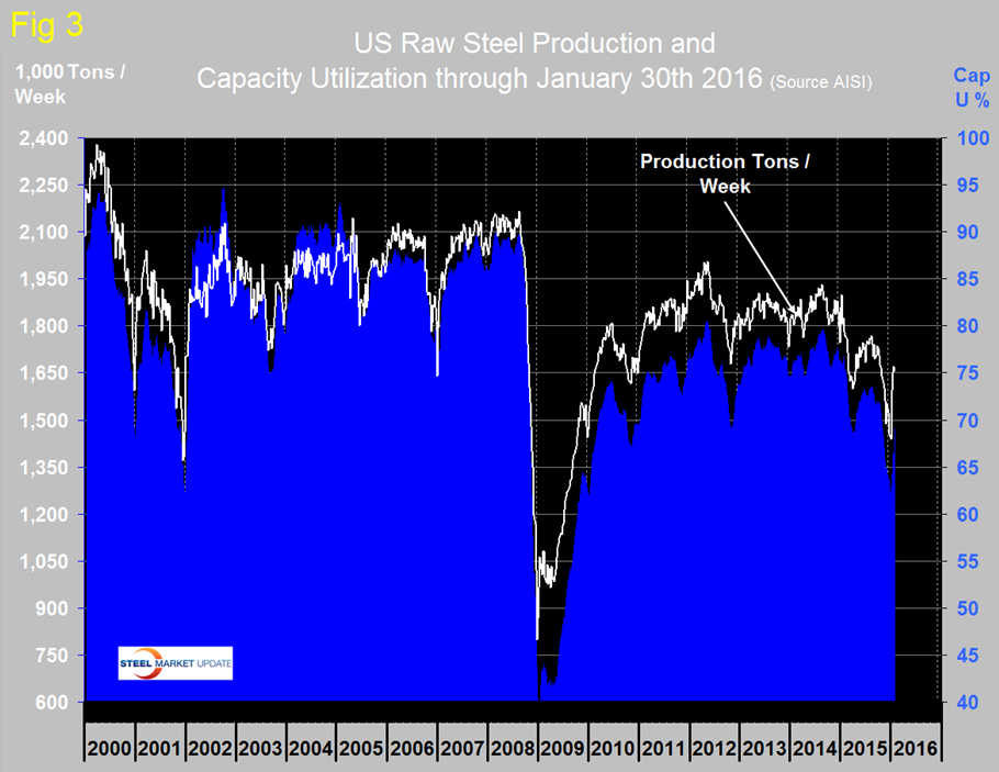 Figure 3 shows weekly production and capacity utilization from January 2000 through January 30th this year.
