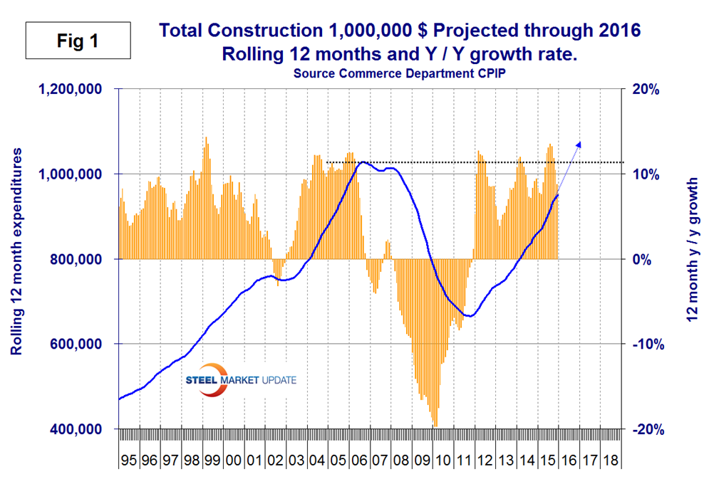 Explanation: The official CPIP press report gives no appreciation of trends on a historical basis and merely compares the current month with the previous one on a seasonally adjusted basis. The detail is hidden in the published tables which we at SMU track and dissect to provide a long term perspective. Our intent is to provide a rout map for those subscribers who are dependent on this industry to “Follow the money.” This is a very broad and complex subject therefore to make this monthly write up more comprehensible we are keeping the information format as consistent as possible. In our opinion the absolute value of the dollar expenditures presented are of little interest. What we are after is the magnitude of growth or contraction of the various sectors. Data is reported by the Commerce Department on both a seasonally adjusted and non-adjusted basis. Their official commentary is based on adjusted numbers. In the SMU analysis we consider only the non-seasonally adjusted data because we don’t trust seasonal adjustments and in any case our businesses operate in a seasonal world. We eliminate seasonal effects by comparing rolling three month expenditures year over year. CPIP data also includes the category of residential improvements which we have removed from our analysis in the rational that such expenditures are minor consumers of steel.