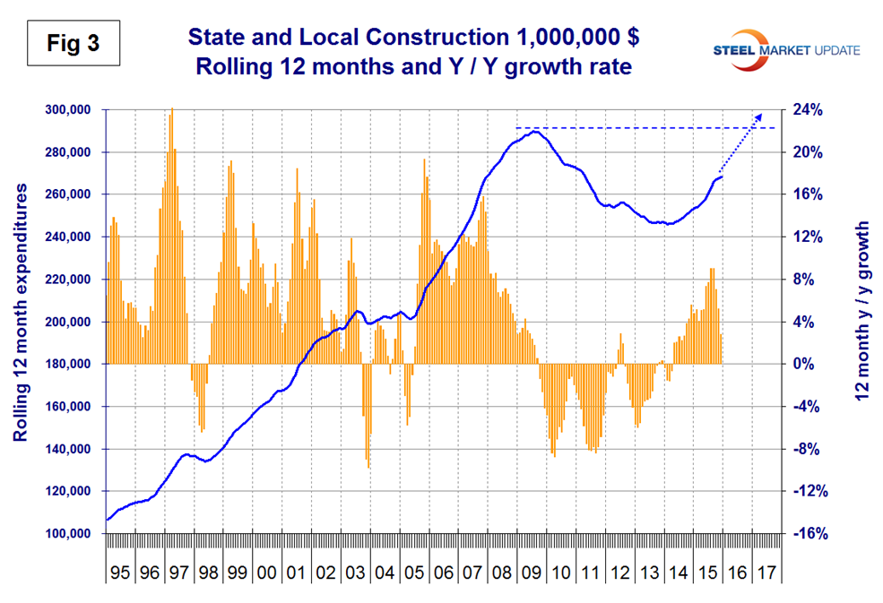 Drilling down into the private and S&L sectors as presented in Tables 2 and 3 shows which project types should be targeted for steel sales and which should be avoided. There are also regional differences to be considered for which data is not available from the Commerce Department. In December 2015 the Bureau of Labor Statistics initiated the reporting of GDP data by state and by sector, including construction and when the next update is released in March we will initiate a routine analysis for our subscribers.