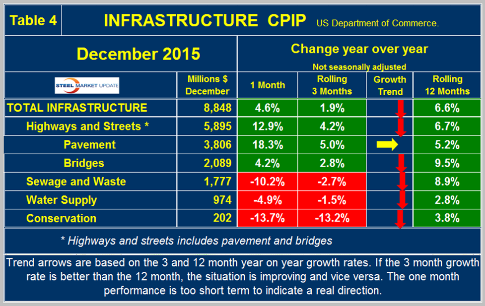 Expenditures have had positive growth every month since July 2013 but growth slowed to +1.9 percent in the latest data with negative momentum. Highway and streets including pavement and bridges accounts for about 2/3 of total infrastructure expenditures and had positive growth for 15 months through February, contracted in March and April then had positive growth ever since culminating in a 4.2 percent rate in three months through December. Highway pavement is the main subcomponent of highways and streets and had a 5.0 percent positive growth in three months through December. Bridge work contracted every month in the period August through December 2014 but has since expanded every month though the growth rate slowed in November and December. Bridge work totaled $2.1 billion in the single month of December with a 2.8 percent growth rate (Table 4).