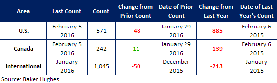 According to Baker Hughes data from February 5, 2016, the U.S rig count for the week was 571 rigs exploring for or developing oil or natural gas. This is a decrease of 48 rigs when compared to last week, with oil rigs down 31 to 467 rigs, gas rigs down 17 to 104 rigs, and miscellaneous rigs unchanged at 0 rigs. Compared to this time last year, the 571 count is down 885 rigs, with oil rigs down 673, gas rigs down 210, and miscellaneous rigs down 2.