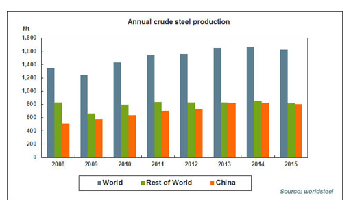 The World Steel Association reported China crude steel output decreased 2.3 percent to 803.8 million tonnes in 2015 but its share of world crude steel production increased from 49.3 percent in 2014 to 49.5 percent in 2015.