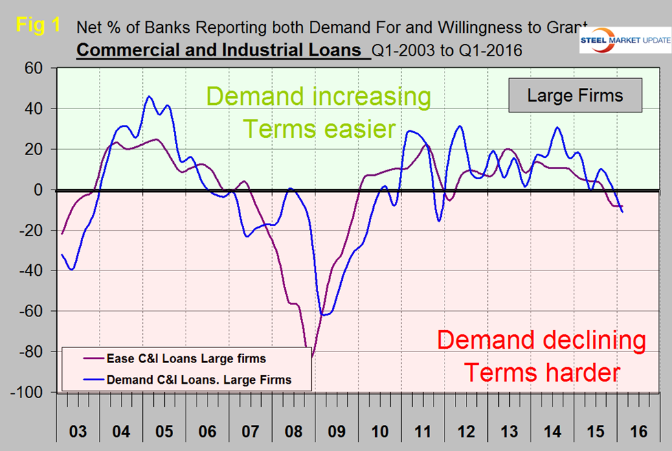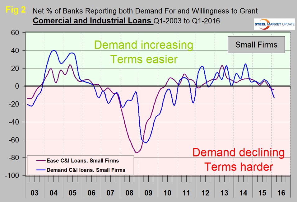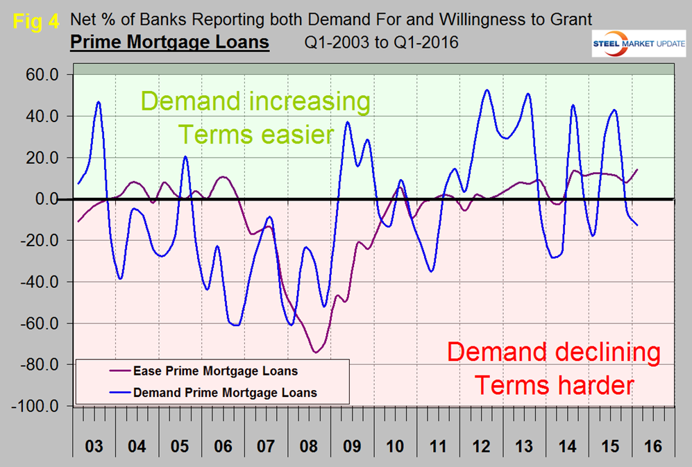 The implications of this report are more or less neutral for the steel market. Loan demand is down for commercial and industrial loans but not drastically so and terms are still reasonable. Demand for construction and land development loans is still good though terms have tightened somewhat. Banks are still relaxing terms for prime home mortgages and demand is better than in the first quarter of the last two years. The survey found a moderate easing of standards on auto loans, while banks reported having left standards on credit card loans basically unchanged. Demand for auto loans and credit card loans remained basically unchanged on net.