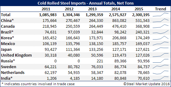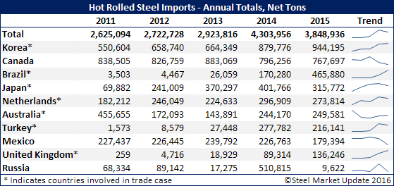 With the release of the December 2015 Final Census data we thought our readers would like to see not only how imports have fared over the past few years but, how those who are the largest exporters fared as well as those who are involved in the hot rolled, cold rolled and CORE (corrosion resistant) trade cases.