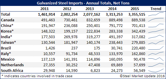Galvanized imports grew during 2015 versus the previous year. As you can see by the table below, GI imports have grown each year with 2014 becoming the watershed moment as imports exceeded 3 million net tons.