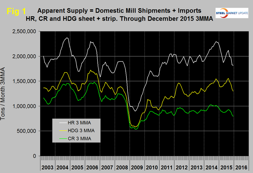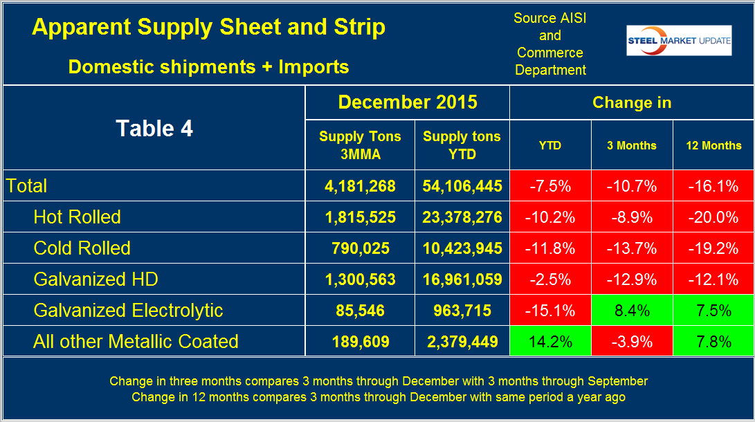 Apparent Supply is a proxy for market demand and is defined as domestic mill shipments to domestic locations plus imports. In three months through December 2015 the average monthly supply of sheet and strip was 4.2 million tons, down by 16.1 percent year over year as mentioned above. In the last three months supply was down by 10.7 percent compared to Q3, July through September and down by 7.5 percent for the year as a whole. The short term decline (3 months) is less than the long term (12 months) which means that the decline is slowing. Table 4 shows the change in supply by product on this basis through December.