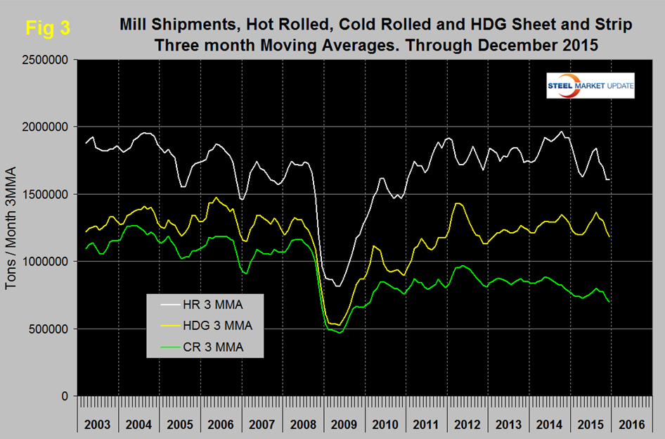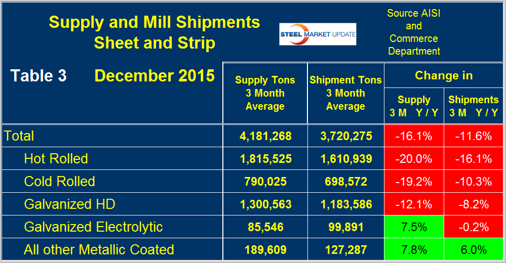 Table 3 shows both supply and mill shipments of sheet products (shipments includes exports) side by side as a three month average for the periods October through December (Q4) for both 2014 and 2015.