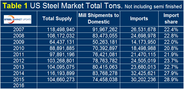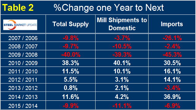 Through the lens of 2015, 2014 looks like a good year with the best supply (a proxy for market demand) picture since 2008. Total supply in 2015 was 104.7 million short tons, down from 116.2 million in 2014 but still the 2nd best year since 2008. It didn’t feel like it partly because import market share at 28.9 percent was the highest in over nine years. Table 2 shows the year/year change for 12 month totals since 2007.