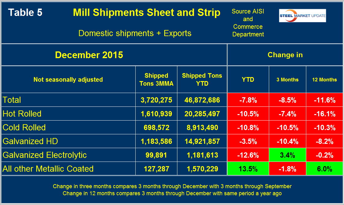 Table 5 shows that total shipments of sheet and strip products including hot rolled, cold rolled and all coated products were down by 11.6 percent in 3 months through December year over year and down by 8.5 percent comparing three months through December with three months through September.