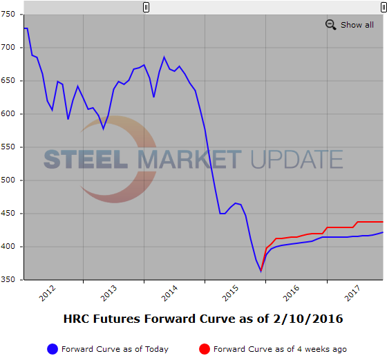 Below is a graphic of the HRC Futures Forward Curve. The interactive capabilities of the graph can only be used in Steel Market Update website here. If you have any issues logging in or navigating the website please contact us at info@steelmarketupdate.com or (800) 432 3475.