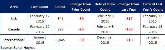According to Baker Hughes data from February 12, 2016, the U.S rig count for the week was 541 rigs exploring for or developing oil or natural gas. This is a decrease of 30 rigs when compared to last week, with oil rigs down 28 to 439 rigs, gas rigs down 2 to 102 rigs, and miscellaneous rigs unchanged at 0 rigs. Compared to this time last year, the 541 count is down 817 rigs, with oil rigs down 617, gas rigs down 198, and miscellaneous rigs down 2.