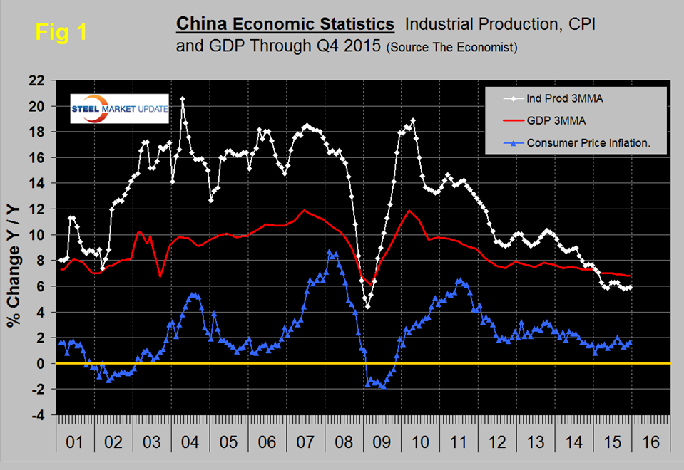 Figure 1 shows published data for the growth of Chinese GDP, industrial production and consumer prices through the fourth quarter of 2015.