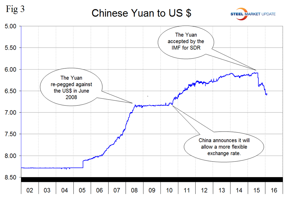 The decline experienced in 2013 accelerated through all of 2014 and through August of 2015. At 10.0 percent in December the growth rate was the lowest since our data begins in 2001. We understand that this data includes real-estate purchases so is not a direct reflection of constructional steel demand. We are assuming that the steel on the ground portion of this data follows the overall trend and that the contraction in FAI is in accordance with the stated objective to rebalance the economy in favor of consumer consumption. Weaker investment in fixed assets is contributing to slower demand across a number of industries including steel and is pressuring corporate profits. Policymakers have tried to soften the landing through interest rate cuts and depreciation of the Yuan but there’s little evidence that this is having the desired effect. Further rate cuts could be on the way later this year. In addition, the slowdown in the global economy will hurt investment in manufacturing. Figure 3 shows the number of Yuan that it took to buy one US $ through February 13th. The Yuan das depreciated by 6.7 percent since its peak on June 22nd last year.