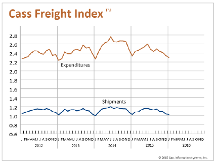Writes Cass: “The number of freight shipments and the dollars spent on freight have been in a typical seasonal decline since September 2015. Our shipment index opened the year just 0.2 percent below last January, while the expenditures index is down 1.4 percent. The economy grew much more slowly in the second half of 2015, so January freight shipments are down 11.6 percent and dollars spent are down 11.5 percent from the June 2015 high. The declines in the fourth quarter and again in January are normal seasonal trends and are not necessarily signs of further weakening.”