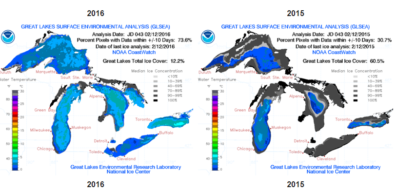 The shipping season is at a lull right now on the Great Lakes and will resume with the re-opening of the Soo Locks on March 25, 2016. Ice coverage is well below that of 2015 at 12.2 percent compared to 60.4 percent on Feb 12, 2014. The milder than usual winter, barring a persistent and severe cold snap, may mean no delay to the start of the shipping season this year.