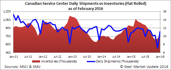 Canadian shipments for all steel products in the month of January were 389,700 net tons, an increase of 42.8 percent from the month before but a decrease of 4.0 percent from January 2015. Inventories at the end of the month stood at 1,250,200 tons, up 7.2 percent from last month but down 19.2 percent from the same month one year ago. The daily average receipt rate for January was 23,695 tons per day (20 day month), up from 13,595 tons per day the month before (21 day month). Total January receipts were 188,400 tons higher than the December figure. According to the MSCI, total steel product inventories stood at 3.2 months at the end of January, down from 4.3 months at the end of December.