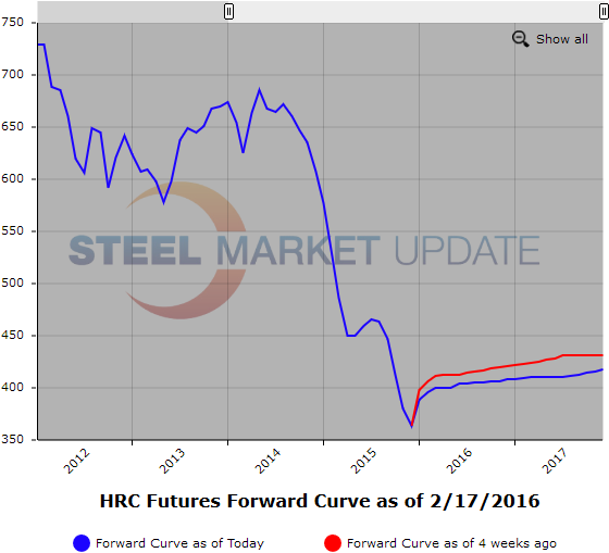 Below is a graphic of the HRC Futures Forward Curve. The interactive capabilities of the graph can only be used in Steel Market Update website here. If you have any issues logging in or navigating the website please contact us at info@steelmarketupdate.com or (800) 432 3475.