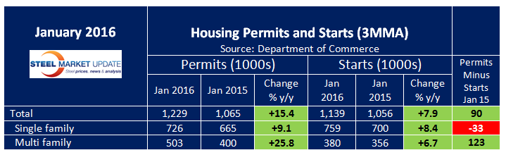The table below shows the three month moving average for housing permits and starts in January has improved year over year. At the national level the differential between permits and starts for single and multi-family units is suggesting that consumers are continuing to favor apartments over single family housing. In January on a 3MMA basis, permits for multi-family exceeded starts by 123,000. In contrast, permit issuance for single family units was 33,000 lower than single family housing starts in January.